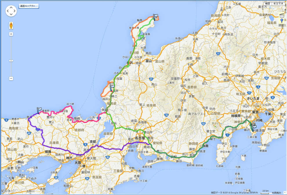 | 1日目:自宅(横須賀)→横浜横須賀道路→東名高速道路→伊勢湾岸道→新名神高速道路→名神高速道路→中国自動車道(山崎IC)→ →国道29号→国道178号→浜坂温泉 (729.1km) 2日目:浜坂温泉→兵庫県道260号三尾浜坂線→餘部鉄橋→国道178号線→兵庫県道1号日高竹野線→城崎温泉→国道178号線→天橋立→ →国道178号→敦賀東IC→舞鶴若狭自動車道→小浜IC→国道27号線→敦賀IC→北陸自動車道→福井IC→福井市 (366.6km) 3日目:福井市内→福井県道6号福井四ッ浦線→国道365号線→国道305号線→東尋坊→金津IC→北陸自動車道→金沢西IC→内灘→ →のと山里海道→今浜IC→千里浜なぎさドライブウェイ→千里浜→国道249号線→輪島→国道249号線→白米の千枚田→国道249号→ →県道28号大谷狼煙飯田線→珠洲市内 (352.5km) 4日目:珠洲市内→国道249号線→珠洲広域農道→県道57号内浦柳田線→県道303号柏木穴水線→国道249号線→ →県道257号田尻乳母浦半浦線→能登島→県道47号七尾能登島公園線→田鶴浜道路→篠田大津JCT→のと里山海道→ →金沢市栗崎→金沢市内(S-GRID)→金沢西IC→北陸自動車道→名神高速道路→東名高速道路→横浜横須賀道路→自宅(横須賀) (774.3km) |