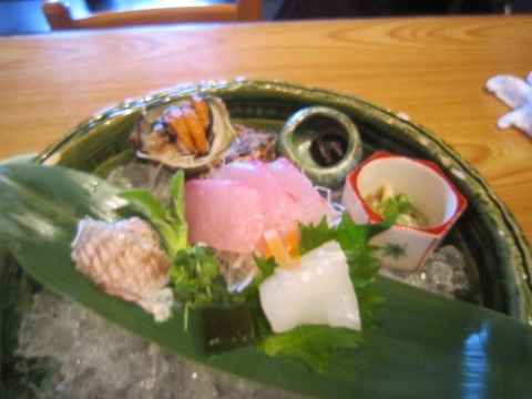 12:45 お造り 丹後セットに付くお造り。 鯛に小っちゃいですがキモ付きのアワビ、カレイの縁側、イカと・・・・、真ん中の魚は忘れました。(笑) どれも新鮮で美味い! 昼食のセットものに付いてくるお造りなんで期待してなかったんですが、全然、レベル高いです。 自分らが行くような回っていないお寿司屋さんでも、これだけ鮮度のいい品物を出してくれるところはなかなか無いですね。 ”ばらちらし膳”が\1,250なので、お造りと吸物があら汁にアップグレードするなら”丹後セット”の方がお得だと思います。 |