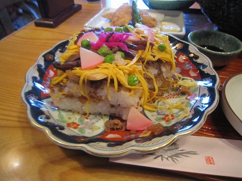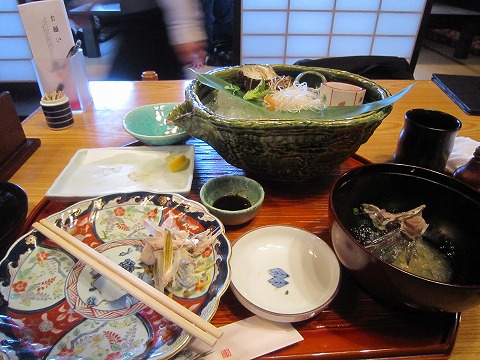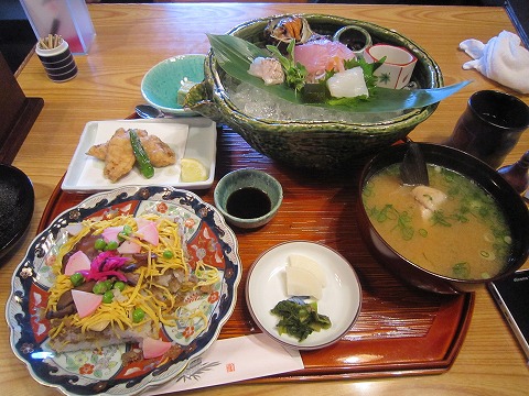 12:43 昼食は網野 お店の入口にもありましたが網野の名物は”ばらずし”だそうです。 ならば頼まねばいかん。 と言うわけで、注文はばらずしが食べられる”丹後セット”(\2,000税抜き)。 名前のつけ方が、地元のお客さんに向けた感じじゃなく、外向きの感じがしますが、それをお願い。 旅行をしたとき、観光客向けのものよりも普段地元の人が食べている料理を食べたいですよね。 このばらずしは観光向けじゃなく、地元の人も食べているような料理だといいんですが。 ちなみに、自分は横須賀に長いこと住んでいますが、ご当地グルメの”横須賀海軍カレー”は知人にもらったレトルトしか食べたことがありません。(爆) なんて、書いている間に丹後セットが運ばれてきました。 それではさっそく、『いただきます!』 |
