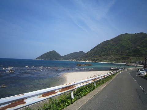 13:39 丹後半島を快走 琴引浜を後にし、国道178号線を快走中。 右手前方には丹後半島の最北端に位置する経ヶ崎が見えてきました。 経ヶ先を過ぎると、その先は若狭湾、国道大きく右にカーブし南下を始めます。 丹後半島の国道178号線は全線片側1車線対面交通の国道です。 海岸線に沿って走る国道は中速コーナーを直線が結び、リッターバイクを気持ち良く安心させ走らせることができるお薦めのコースです。 |