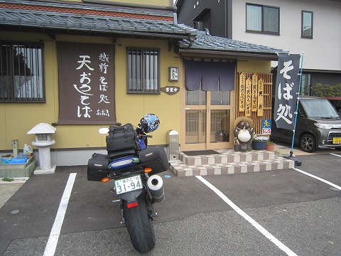 11:26 ちょっと早めの昼食 ツーリング3日目は福井市を出発し、東尋坊に寄ってきました。 東尋坊を出発し、国道305号線に戻る加戸の交差点で信号待ち。 ふと、左側を見ると”天おろしそば”の幟が。 「福井に来たら、おろしそばを食べんとはいかんばい。」 (と頭の中で訳のわからない方言でつぶやいて) 11時半前でちょっと早いですが、店先には営業中の看板が出ていたので、今日の昼はここで食べることにしました。 お店の名前は”そば処あおき” まだだれも停まっていない駐車場にバイクを駐めて、さっそくお店に入ります。 店内は5〜6席のカウンターと4人がけのテーブルが4卓ぐらいだったかな。 お店は夫婦でやっているようです。 |