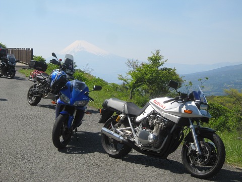 14:08 途中で 亀石峠のパーキングで休憩した後、行きに来た道を取って帰ります。 伊豆スカイラインの途中でバイクを駐めて、写真撮影。 富士山をバックにバイクを並べて。 午後になって、視界が少し悪くなったので、コントラストが落ちましたね。 バックの富士山がぼんやりです。 (-_-;) |