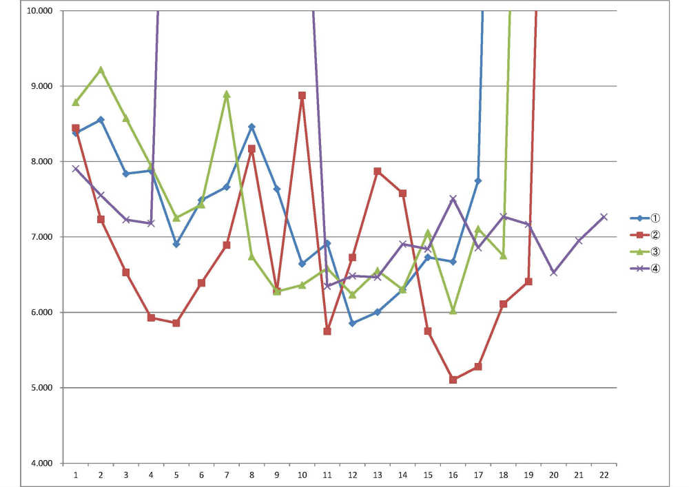 | グラフが飛び上がっちゃっているとことは、ピットインしたところ。 コースインして1周目は、8秒台。 そこから、毎回ペースアップして5周目くらいまで、一旦タイムを縮めていってる。 1本目は1年ぶりで探りながらと言うこともあってか、さすがにタイムアップの量が少ないね。 2本目は、6周目まできれいにペースアップしている。 2本目は色々とトライしている(欲を出している)みたいで、タイムのバラツキが大きい。 3本目は、2周目にタイムが落ちてる。 付け替えたブレンボのブレーキディスクで、ちょっと何か試してミスったんだね。 (たぶん、すり鉢コーナーでちょっとオーバーランしたときかな?) その後は地味にペースアップして、午後になって無理をしなかったこともあって、タイム的には高めだけど、一番安定している。 4本目は最後の走行と言うことで、追走のタイミングをとるために、途中でピットインしている。 追走するために、10周目にピットアウトして、いきなりペースアップしているけど、疲れて徐々にペースダウンしているね。(笑) これじゃエビナさんに追いつかない訳だ! 全体で7〜8周目にペースダウンしているね。 これは、たぶんコースインして最初は集中しているけど、一段落して集中力が落ちているんだろうね。 この落ち込みが無いようにしないとダメだね。 その他、タイムがばらついているのは、自分がなんかしようとしてたり、前の走行車に追いついて、抜いたりしてるんだね。 こうして、グラフにすると、ベストは5秒1だけど、コンスタントにラップできる実力的には6秒台の中と言ったところなんだろう。 それは以前に比べると、マージンを大きく取っていることもある。 以前であれば、「とりゃ〜ぁ!」って気合いを入れてコーナーに入っていくこともあった。 でも、今回はしない。 転んだら痛いからね。 加齢と共にライディングのバラツキも大きくなるんだろうからね。 なので、確実な走りをしているんだけど。(言い訳っぽいよね) あと、追記すると、すり鉢のところがパッチ状に再舗装されて、つなぎ目に段差ができちゃった。 ブレーキングでちょっとリヤが跳ねるのと、立ち上がりで段差を越えていくので、ちょっとアクセルが開けきれない。 それと、再舗装部分もグリップが悪そうな感じ。(と言っても、黒目の舗装で目から入ってくる情報なんですけどね。特に滑った訳じゃない) |