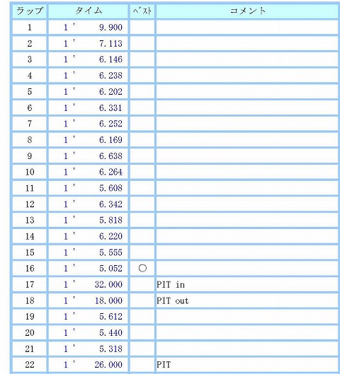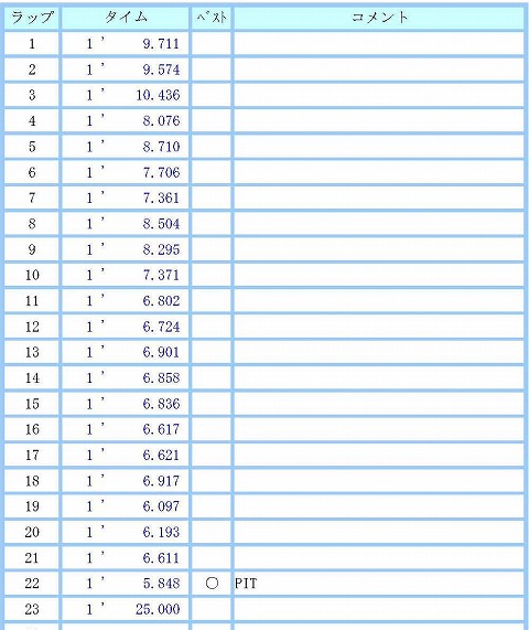 15:15〜15:40 B2 15:15の定時になってB2の走行が始まりました。 ちなみに、走行台数はたぶん10台くらい。 で、とっても走りやすい! (^_^)v そして前に3〜4台、ちょうどいいペースで走っているので、追走することに。 イニシャルを半回転入れたんだけど、フィーリングが思った以上に違いましたね。 底付き感は無くなったけど、ちょっとつっぱり感が出ました。 前走のバイクがピットインしたりして、前がクリアーになったので、ちょっと頑張ってみます。 11周目あたりから5秒台に突入。 Metzelerのタイヤは良く機能してくれて、自分レベルのタイムだと全然滑る気配なし。 ブレーキングのタイミングを確認しつつ、コーナーへの進入速度をちょっとづつ上げて行きます。 15周目あたりで疲れてきたので、最後ちょっと頑張ってピットイン。 16周目に今日のベスト5秒0。 残念ながら、4秒台には入りませんでしたね。 あんまり欲を出すと、すっ転んじゃうので、ほどほどにしておきます。 イイ感じで乗れているので、本日はこの辺で。 |