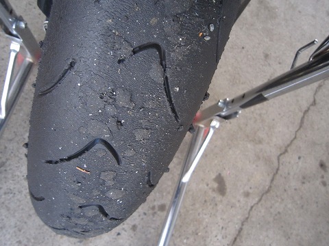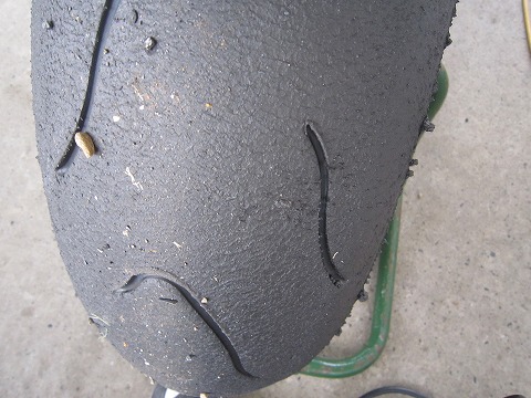 15:48 走行後のタイヤ 走行終了後のタイヤ。 前回までで2時間、今回を合わせて3時間弱。 リヤの寝かして開けていく、中間のバンクのところが減ってきているけど、まだまだ大丈夫。 フロントはまだまだって感じで、前後ともライフ長いですね。 次回の特スポもこれでいけます。 (^_^)v コンパウンドも前後とも軟らかい方のK1だけど、今のところ自分的には問題なし。 今日の走行中は1本目も2本目も40℃ぐらいだったけど、このくらいの温度だったら、K1で大丈夫みたいだね。 |