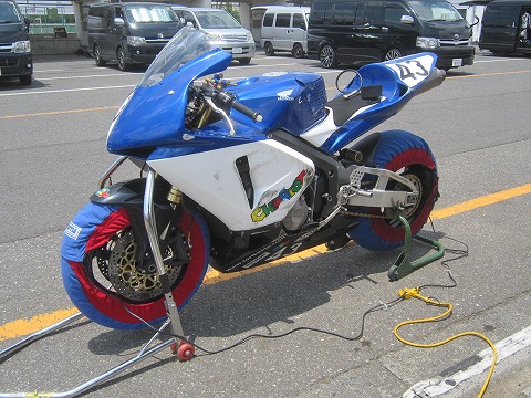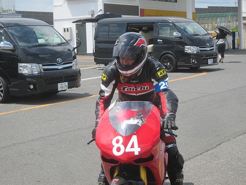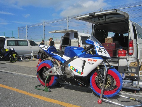 12:03 エビナさんも一緒 昼食を食べて、ハイエースのところに戻って、タイヤウォーマーに電気を入れて暖めます。 季節的にもう暑いので、1時間ちょっとあれば大丈夫でしょう。 そして後ろの#84は、エビナさんのドカ1098。 日曜日のバトル・オブ・ツイン(BOT)にエントリーしています。 BOTのレースは日曜日なので、今日早くきて場所取りをする必要はなし。 自分がお昼を食べに行くちょっと前に、サーキットに到着しました。 |