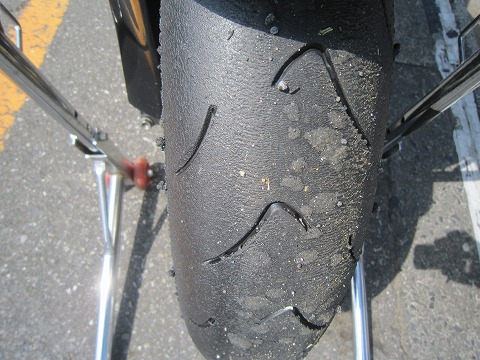 15:59 走行後の 走行後のタイヤ。 やっぱり、右側の開けていくところが、ほとんど溝が無いね。 これで大体Metzelerのライフがわかりました。 とりあえず、1セット目を使い終わりました。 フロント側はまだまだ残ってますねぇ。 フロントはR1とサイズ同じだから、一般道で使おうか。 Metzelerは一般道でも使用”可”だからね。 |