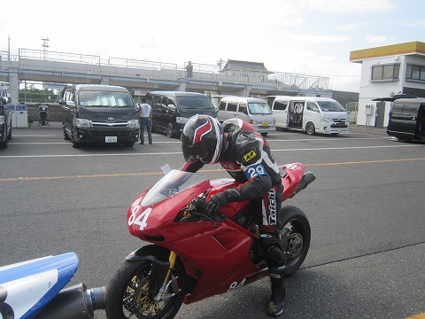 15:30〜15:50 特別スポーツ走行 2本目 15時30分、定刻になって特スポ2本目のスタート。 で、コースイン。 今回の特スポ、NMクラスとGSX-RとかのSUZUKI CUP、それにビックシングルと混走だったんで、走りにくそうとか思っていたんだけど、走行台数が思ったより少なく、そう言った点では走りにくさは無かったかな。 コースインして、ペースを上げていくと、1コーナーでリヤが”ツィ〜”と。 『おお! 滑るねぇ。』 タイヤ終了だな。 Metzelerはこんな感じで滑るんですねぇ。 その後も、第2ヘアピンやDUNLOP下で滑ったので、レース前に4秒台に入れておきたかったんだけど、やめておきます。 とりえあず、色々確認しつつ、時間いっぱい走って、本日の特スポ、無事終了〜! |