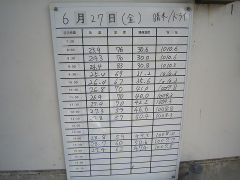 15:18 コンディション コースインゲート脇に掲示されている今日のコンディション。 1本目の走行の時は、気温が30℃弱、路面温度は50℃前後あったみたいですね。 |