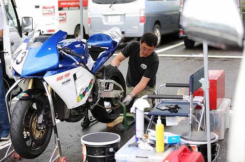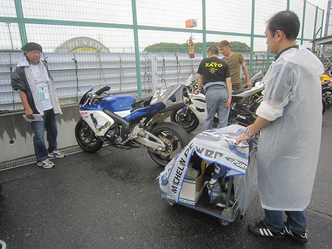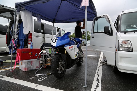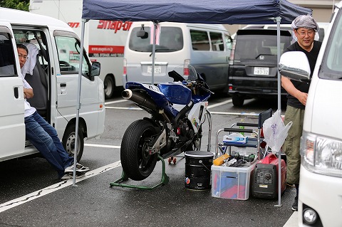 8:21 ウォーミングアップエリアへ 車検が終わったら、ウォーミングアップエリアに移動。 エンジンを暖機。 昨晩換えたオイルに問題が無いかも確認。 今回レインタイヤで、季節的にも暖かい(暑い)季節なのでウォーマーはなし。 ウォーマーをかけても、ドライコンディションの様にタイヤが熱くなることはなく、すぐに一定の温度まで下がってしまうらしい。 今回手伝いに来てくれたのは、さっきの伊藤さんと明日のBOT(バトルオブツイン)にエントリーしているエビナさんの2名。 |
