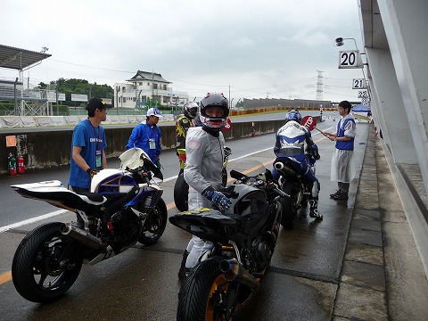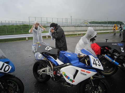 8:05 順番待ち 車検場の入口に到着。 車検の順番待ちます。 8時から他のクラスの予選が始まっていて、雨の中タイムアタックをしています。 順番待ちの間、ウェットコンディションの中、1コーナーに突っ込んでいくバイクを見ていると、自分も同じように走らないといけないかと思うと、ちょっとビビリますね。(-_-;) |