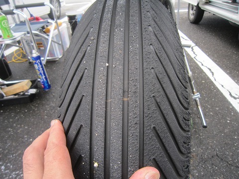 11:00 タイヤは タイヤは・・・。とか言ってる場合じゃ無いよね。 最後、ドライ部分があったにもかかわらず、寝かしているところがサラッとしている。 エンド部分の溶けているのは、自分ではなく、以前に某ライダーが使った跡だ。 |