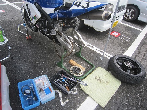 7:23 準備 7時前に到着して、まずはテントを設営。 雨の可能性があったので、仕事先から借りてきていました。 テントの設営が終わったら、マシンや機材をハイエースから下ろして、準備。 昨晩せっかく、K2Yで新品のタイヤを履いたのに、レインタイヤに交換です。 |