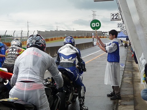 9:45 先頭 な〜んて、お気楽にピットロードまで押して行ったら、いつの間にか先頭になっちゃった。(汗) ドライタイヤだったら、暖めたタイヤを冷やさないように先頭で出ていって、ガンガン走る必要がありますが、レインタイヤだとやっぱり最初の2〜3周は様子を見て、と言うより、ライダーが慣れるのに様子をみて、徐々にペースを上げていきたいところなので、先頭である必要はないよね。 ちなみに、今回自分が撮った写真と、伊藤さん、エビナさんが撮った写真が混在しいているんだけど、デジカメの時計があっていないみたい。(汗) 予選開始が9時25分からだっから、この写真は時計が狂ってるみたいだ。 |