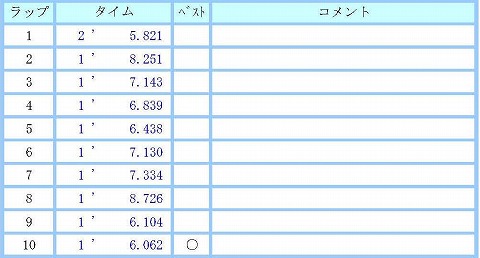 レース中のタイムを見てみると、全体的に6秒台〜7秒台で全然良くないね。 1周目は、ウォーミングアップからだから、タイムは不明。 2周目から計測したタイムになるけど、2周目はまだ混戦でペースが上がってないんだろうね。 8周目は1ヘアピンで、前を抜こうとしたんだけど、インを締められて当たりそうになったんで、避けたら遠回りになってしまいタイムロス。 予選と同じで、徐々にペースが上がって、ベストは最終周の10周目。 やっぱり普段からタイム出してないと、レースの時にニュータイヤ履いても、ポンッとはタイムは出せないね。 (-_-;) |