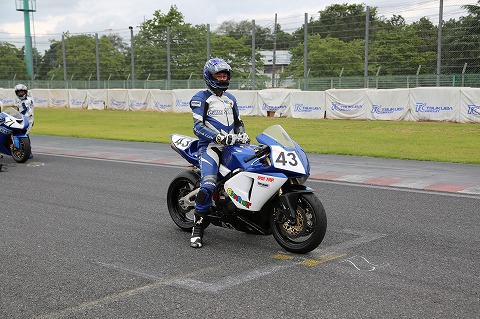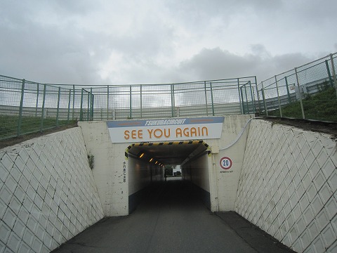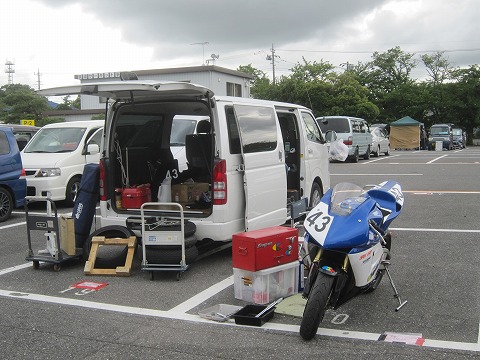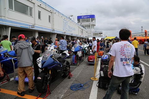 パドックへ 1周のウィニングラップを終え、上位6位までは表彰台へ。 その他大勢はピットロードエンドからパドックに退場。 そのまま、バイクを押してハイエースを駐めてある駐車場まで戻ります。 |