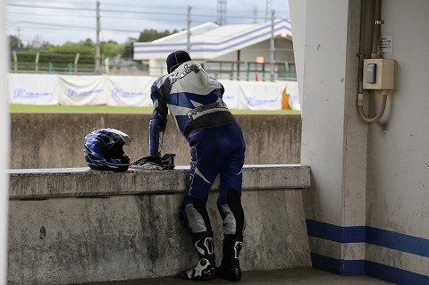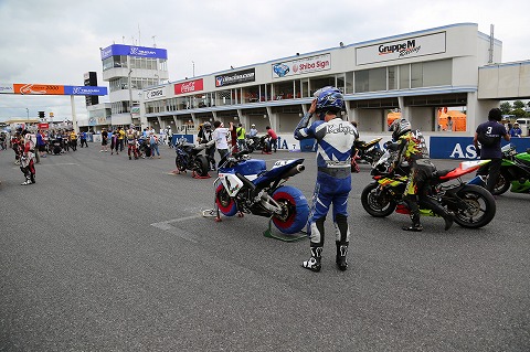 13:17 スタート前チェック 決勝前のスタート前チェックを終えて、パドックにバイクを並べます。 けっこうドンヨリと雲が垂れ込めていますが、ここまで雨はなくコースコンディションはドライ。 タイヤもドライに履き替えて、ウォーマーをかけて決勝にのぞみます。 |