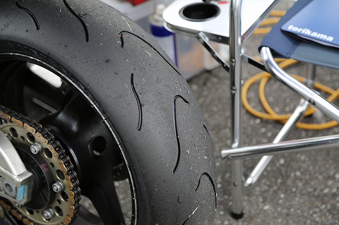 11:20 決勝に向けて 予選終了、一段落して決勝の準備を始めます。 予選の後、雨は止んで路面は乾いていきますが、見上げる空には雲に覆われていて、いつ雨が降り出してもおかしくない状況です。 NMクラスのスタート進行は13時15分から。 それまでにまた雨が降り出す可能性もあるので、予選のときと同じようにドライとウェットの両方を準備しておきます。 レインタイヤのリヤは、ユーズドですがもう1本あって、取っておいても仕様がないので、交換して決勝で使っちゃおう。 |