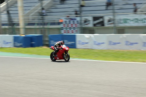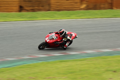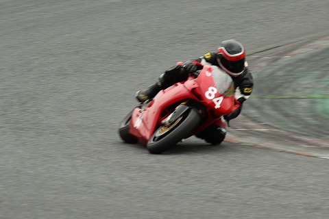 10:09 1ヘアピン 予選が開始され、ダッシュでピットロードから第1ヘアピンまで走ってきました。(滝汗) 予選は15分間。 1ヘアピンでカメラを構えていると#84 エビナさんがやったきました。 |