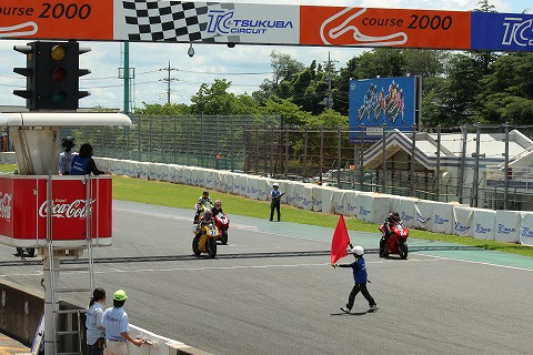 12:40 チェッカー 最終周、10周を終えて#84のエビナさんトップでホームストレートに戻ってきました。 2番手に3秒のタイム差を付け、ガッツポーズでチェッカー。 やったね! 優勝だ! 結果、優勝。 ベストタイム7周目1分3秒692。 |