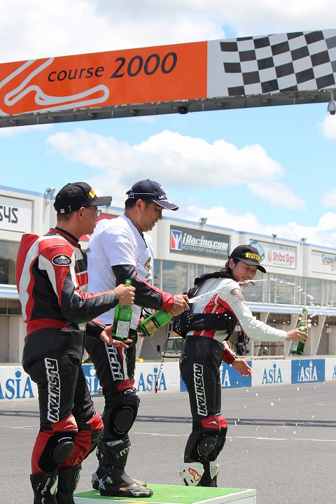 12:46 優勝! レースのあとは表彰式。 で、シャンペンファイト! (注:ノンアルコールです。(笑)) 『優勝おめでとう!』 |