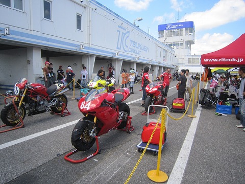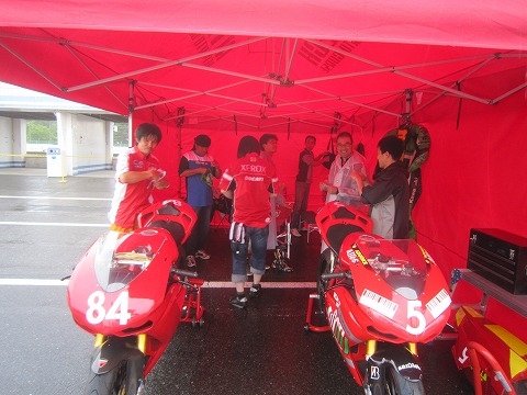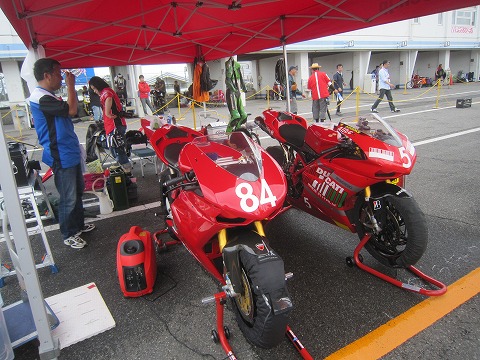 7:03 テントの中は テントの中には今回エントリーした2台が既に搬入済。 レースに向けて準備をしています。 エビナさんのバイクは左手の#84。 マシンはドカの1098Sだ。 |