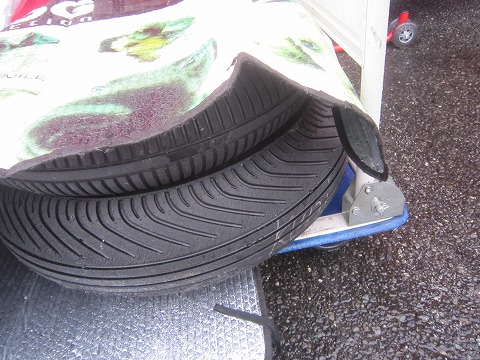 7:29 レインタイヤを 今回エビナさんは、ウェットコンディションになることを想定してなかった。 (梅雨のこの時期に想定しないのは無謀だと思うが・・・。) なので、レインタイヤの準備はなし。 ところが、早朝からしっかりと雨。 流石にレインタイヤを・・・・と思っても、タイヤサービスは既に在庫切れ。 なので、最悪自分のレインに履き替えて走ることにしよう。とレインタイヤを準備。 実際はドライになって使わなかったが、恩着せがましく書いておく。(爆) |