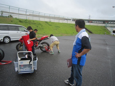 8:40 車検 車検は8時45分から。 車検場には少し前にいって、待っておく。 雨は既に止んで、後はまた降ってこないことと、路面が乾くのを待つのみ。 |