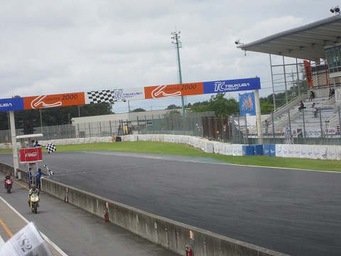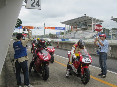 12:23 グリッドに 前のクラスの決勝が終わり、グリッドにバイクを並べます。 『う〜ん。ポールかぁ。 カッコイイ!』 この後、ポールから順番に選手紹介。 その後、ピットクルーがコースオフ。 |