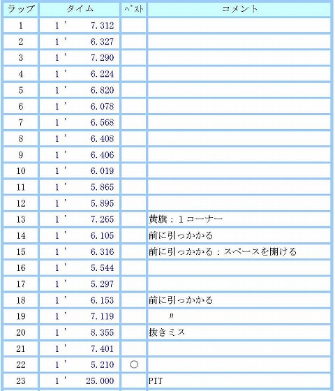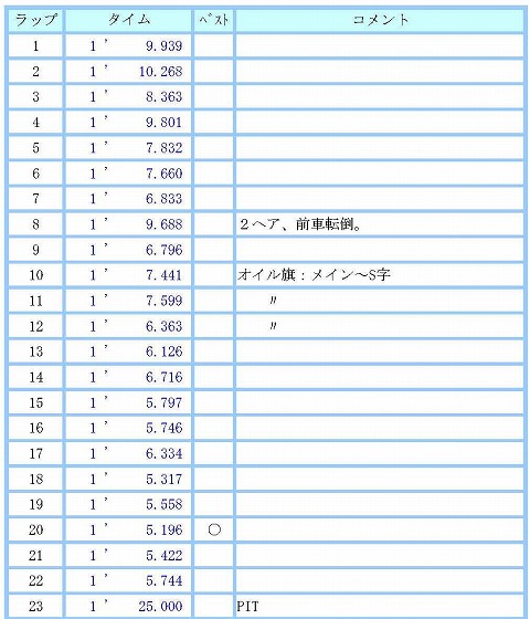 9:38 タイム的には 1本目の走行が終わり、パドックに戻ってきました。 パドックに戻ってP-LAPのタイムを確認。 前回のレースではギリギリ6秒を切るくらいのタイムしか出ませんでしたが、楽しく走っても普段の5秒前半くらいまでは出てるんだねね。 (^_^;) このくらいのタイムまでは、(タイヤは)まったく滑る気配なし。 ここから先、タイムを縮めていくと、ところどころタイヤが滑ったりすることもある。 まあ、大体の場合大丈夫なんだけど、たまにやらかしちゃう。 以前は、そこまでやって、たまに転倒してました。 でも、今はダメだ。 完全に安全パイを握って走ってます。 それは、以前と仕事の内容も変わってきて、穴が開けられなくなったこともある。 それに、昔は皮つなぎを着れば、カブトムシくらい丈夫だと勘違いしていたが、2回目の転倒で、人間の体はそれほど丈夫じゃないのに気付いたこともある。(笑) |