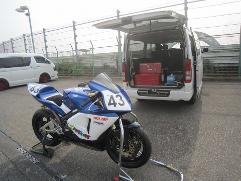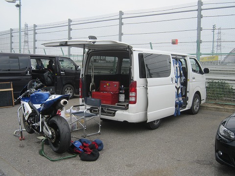 7:37 まず一番にやることは さっそく、ハイエースからバイクを下ろして、走行の準備。 ハイエースからバイクを下ろして、まず1番にやることは、チェーン引き。 Metzelerのリヤタイヤが大きくて、ハイエースのリヤゲートに当たって閉まらないので、毎回チェーンを緩めてリヤタイヤを一番前に移動しています。 なので、 ・自宅でハイエースにバイクを積み込む → リヤタイヤを前に移動。 ・サーキットに到着 → リヤタイヤを元に戻して、チェーン引き。 ・走行終了、バイクを積み込む → リヤタイヤを前に移動。 ・自宅に帰着 → リヤタイヤを元に戻して、ハイエースから下ろす。 の繰り返しですが、これも慣れましたね。 |