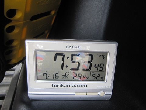 7:53 暑い! 暑いね。 開けっ放しのハイエースの荷台の気温が29.4℃。 曇っているけど、29℃は暑い。 準備をしていると、額から汗が噴き出します。 でも、この時期、晴れていたらもっと暑いんだろうね。 |