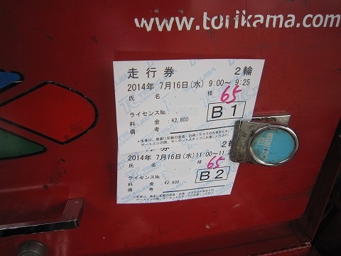 8:28 走行券を買ってきた 走行券を買ってきました。 1本目が9時から、2本目は11時から。 前回、6月13日の練習のとき、当日の天気が不安定で、走行枠に余裕があるからって当日券を買ったら、\500高かった。 当日券は\500高いんだね。 なので、今回はネット予約締め切り直前の前日の夜の10時に予約。 平日 25分間×2本 = \2,600×2本 = \5,200也 |