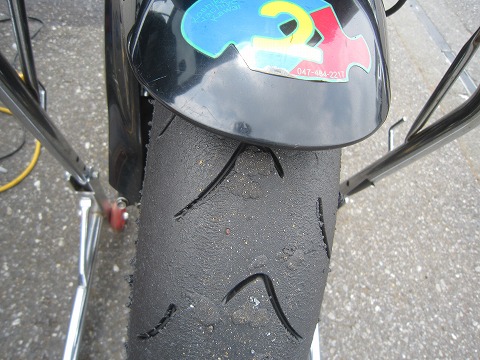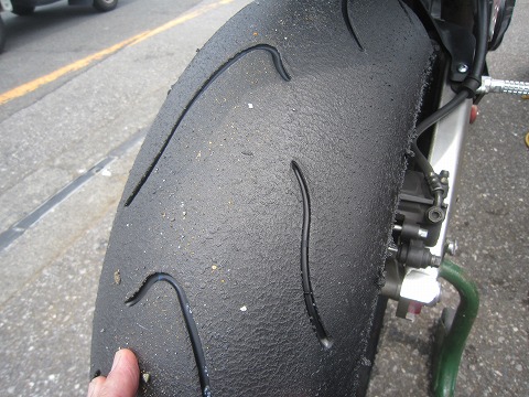 11:32 走行後のタイヤ 走行終了後のタイヤ。 前回、筑波TTの決勝で使って10周ちょいと、今日の25分×2本。 トータルで約1時間走行。 まだまだ、溝ありますね。 ここまで走行して1本目、フロント側は走り出し190Nで、走行後180Nと下がり気味。 リヤ側は走り出し190Nで、走行後200Nと上がり気味。 なので、2本目はフロントを200Nスタート、で終わり195N リヤは180Nスタートで終わり195Nでした。 チェッカー後のラップはかなり遅いから、若干エアー圧が下がっちゃうと思うけど、これくらいの気候だと、こんなもんでイイかな。 って言うか、1本目と2本目のエアー圧の違い、『走りでは、わかりませんでした。』 ( ̄。 ̄;) |