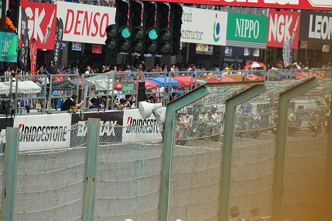 11:22 ウォーミングアップラン 8耐のスタートは定刻11時30分。 8分前になって、ウォーミングアップランがスタートしました。 各マシン、グリッドからスタートします。 この場所は肉眼で観戦するにはイイけど、カメラに収めるとフェンスが邪魔だね。 |