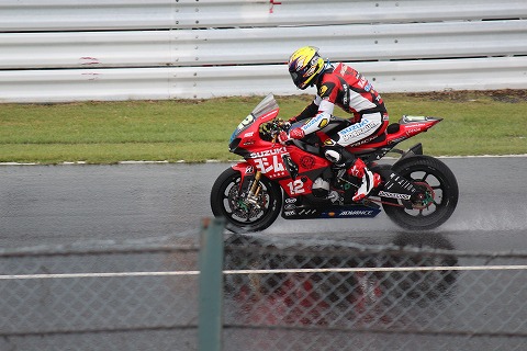 12:15 再サイティングラップ 12時15分になり、ピットロードエンドがオープンになり、サイティングラップが始まりました。 自分は再び、メインストレートエンドの自由席に陣取って、スタートを観戦。 目の前を、ヨシムラのマシンが通過していきます。 自分自身はとってもヨシムラのファンと言うことではなくて、ファインダーをのぞいていると、この赤のカラーリングが目立つので、ついついシャッターを押すチャンスが増えるんですよね。 ちなみに#12は2台エントリーしているヨシムラのマシンの1台で、ヨシムラレジェンドチーム。 ライダーは青木宣篤選手。 しかし、凄い水の量だね。 水はけの良いサーキットの路面が水たまり状態になってる。 |
