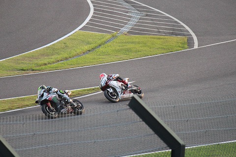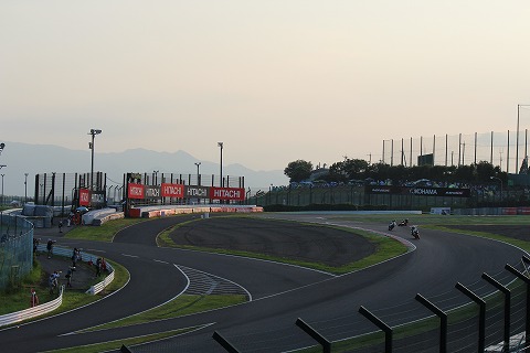 18:00 最終コーナーに移動 夕方になって、S字から最終コーナー側のスタンドに移動。 5時間経過を前に、トップを走っていた#11 TSR 秋吉選手がライディング中、スプーンカーブで転倒。 戦線を離脱します。 代わってトップに立ったのは、#634のHARC-PRO。 現在の順位は2位に#34のヨシムラ。 3位は#17のTeam KAGAYAMA と続いています。 |