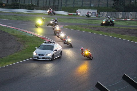 19:07 7時を過ぎて 7時を過ぎて辺りが暗くなってきました。 ゴールまで残り30分を切ったころ、1コーナーで転倒がありペースカーが入ります。 |