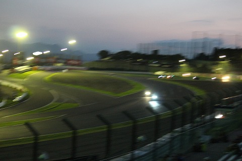 19:31 ゴール! 午後7時30分を過ぎました。 トップを走っていた#634 Musashi HARC-PROのマシンが最終コーナーを立ち上がり、ゴールラインを目指します。 トップがゴールラインを通過、チェッカーを受けた時点でレースが終了になります。 けど、すっかり暗くなって、写真がボケボケだね。 何だか、わからないや。 |