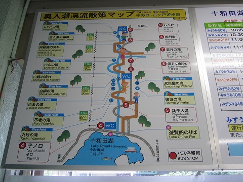 奥入瀬渓流の遊歩道は、十和田湖の子の口(ねのくち)から石ヶ戸(いしげど)まで全長8km、徒歩に2時間半ほどだそうです。