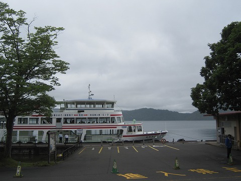 いつ雨が降り始めてもいいよう、ビニール傘を持って宿から歩いて十和田湖畔の”休屋”にやってきました。