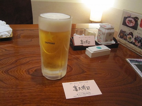 19:00 とりあえず さっそく入店。 店内はカウンターは5~6人が座れる小さなものですが、小部屋が10部屋ほどあるみたい。 お盆の最後の日曜日と言うこともあり、お客さんが一杯で繁盛してますね。 そして、とりあえず生で。 『お疲れさん!』 |