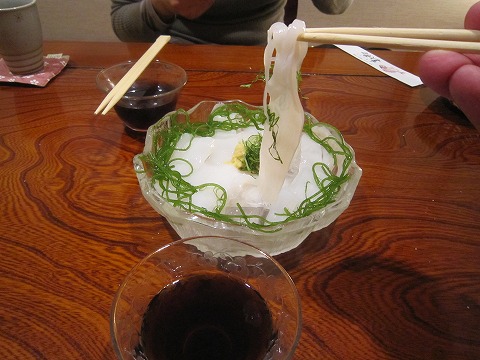 19:08 イカが旨い そして、注文一発目は、イカそうめん。 昼間食べたイカが旨かったので、また頼んじゃった。 で、やっぱり旨い! イカはホント細く切られていて、しかもイカそうめんのイカがこんなに長いのも、初めてだね。(笑) これで480円安いよね。 |