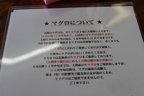 13:55 能書き読む 店内に入ってメニューを見ると、”マグロについて”の能書きが。 8月は大間沖(津軽海峡)のマグロじゃないのね。 まあ、近海物でも美味ければいいのだよ。 自分の注文はちょっとお高いがせっかくなので、黒板にあった”まぐろだけ丼(\2,800)”。 自分は食べ物に関して、”せっかくなので”が多すぎる様な気がするのは気のせいだろう。 で、嫁さんは昨晩食べた殻付きのウニの味に感動して”ウニ丼(\2,300)”を注文。 |