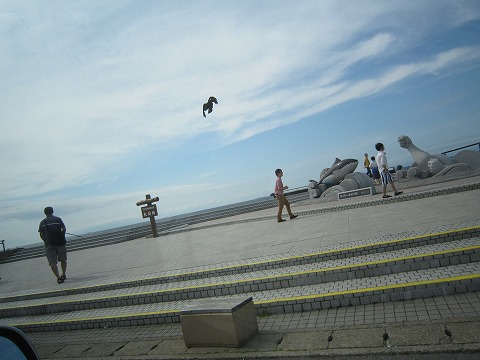 14:22 マグロとじゃれる そしてマグロのモニュメント。 嫁さんが撮ると言うので、マグロとじゃれてみた。 こんなところで、胃も落ち着いたので、ぼちぼち帰路に就くとしますか。 |