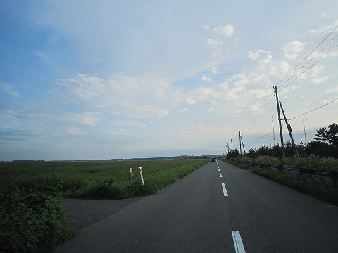 17:05 三沢市に 国道338号線で六カ所村を南下し、三沢市に戻ってきました。 小川原湖と太平洋を接続する高瀬川放水路に架かる橋を渡ると、標識が現れ、県道170号天ヶ森三沢線に入り南下を続けます。 行きにも通ったこの県道170号線の両側に畑が広がる風景は心が和みますね。 |