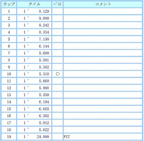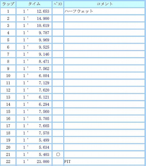 10:30〜10:55 B2 10時30分になって、今日2本目の走行を開始。 顔見知りの人に、新しい舗装について聞いてみるとグリップは上がっているみたいだが・・・・、グリップが上がっているのでパワー食われて、今までの乗り方だと、スピードが落ち過ぎちゃうみたい。 タイムを上げるには乗り方を変えないとダメだね。と言う意見が。 と言うことで、2本目はコーナー立ち上がりで早めに姿勢(ポジション)を整えるのと、最終コーナーはスピードが落ちない様に早めにアクセルを開けてみることをトライしてみます。 コースインして5周目くらいまで、コースを再確認。 1ヘアピンはイン側のすり鉢状にカントが急になっているところが無くなっちゃって、全体的にスムーズなカントになっちゃったかな。 最終コーナーは確かにスピードが食われるみたいです。 進入はちょっとだけスピードを上げて、ブレーキを引きずり気味に入っていくことにトライしてみます。 が、今までよりブレーキを強めに引きずって入っていくと、チャタリングがひどくなりましたね。 これ以上強めのブレーキングは怖い。 ライディングの姿勢(ポジション)も早め早めに体勢を整えるようにして・・・・。 後からデータを確認すると7周目〜13周目までコンスタントに5秒台が出てますね。 今の時点で安定して出せてきているので、次なるアタックが可能だと思います。 けど、その前に最終入口のチャタをどうにかしないとね。 14周目から少し疲れが出たのか、ライディングがバラツキ始めます。 そうすると、タイムがダウン。 もう一回ガンバって、17周目に5秒台に入りましたが、今日は無理をしない方が良いので18周を終えた時点で、残り時間がありますが、ピットイン。 今日のベストは5秒3でしたね。 |