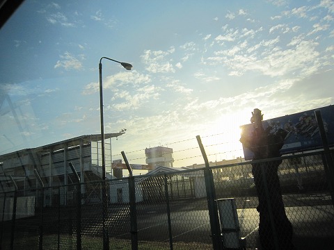 6:20 駐めたのは 1コーナー下の地下トンネルを通ってパドックへ。 『ありゃま。ピットが一杯じゃあ〜りませんか!』 で、ハイエースを駐めた場所はガソリンスタンド先の車検場横。 明日はパドックに入れませんが、今日はここでよろしいかと。 ※ 右手の中指は、カメラに写りたがりだね。(笑) |