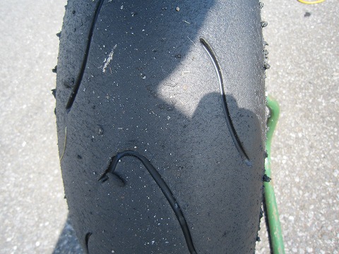 11:12 走行後のタイヤ 走行終了後のタイヤ。 前回、筑波TTの決勝で使って10周ちょいと、前回の練習が25分×2本。 今日、25分×2本 トータルで2時間弱走行。 リヤは5分山と言ったところですかね。 美味しいところは終わっちゃっているんで、あとはエビスの走行会用かな。 新しい舗装になって、リヤがボロボロになっちゃう人もいるみたいだけど、自分は今のところは大丈夫みたいです。 減り方は、タイヤとか乗り方で全然変わっちゃうから、何とも言えないですね。 で、チャタリングはどうするか? 明らかにディスクローターみたい。 最終の入口で、チャタが出ている時点でブレーキレバーをリリースすると、チャタは消えるからね。 このディスクに交換してから、チャタは出てなかったから、路面とタイヤとの相性があるんだろうね。 いずれにせよ、今の状態ではディスクローターは交換しないとダメだね。 とりあえず、レインタイヤのホイールに付いている純正のディスクローターを使うか。 K2Yに行ってディスクローターを借りるか、それとも自宅に置いてある前に使っていたディスクローターを取りに帰るか。 考えるべ。 |