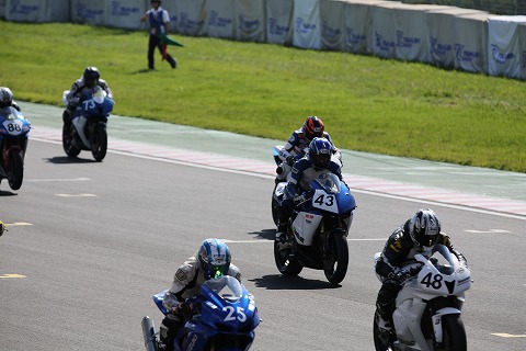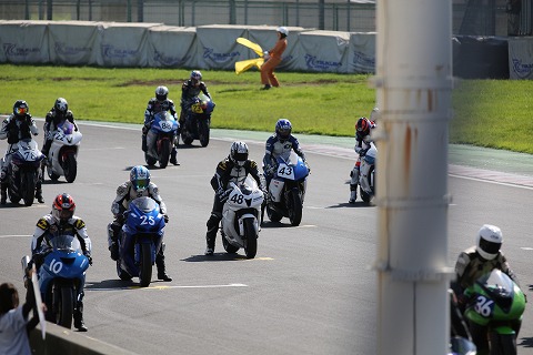 13:34 サイティングラップ 選手紹介のあと、サイティングラップ兼ウォーミングアップでコースを1周。 各バイクがスターティング・グリッドに戻って来ました。 全部のバイクがグリッドに付いたら、日章旗が振り下ろされて、レースのスタートになります。 |